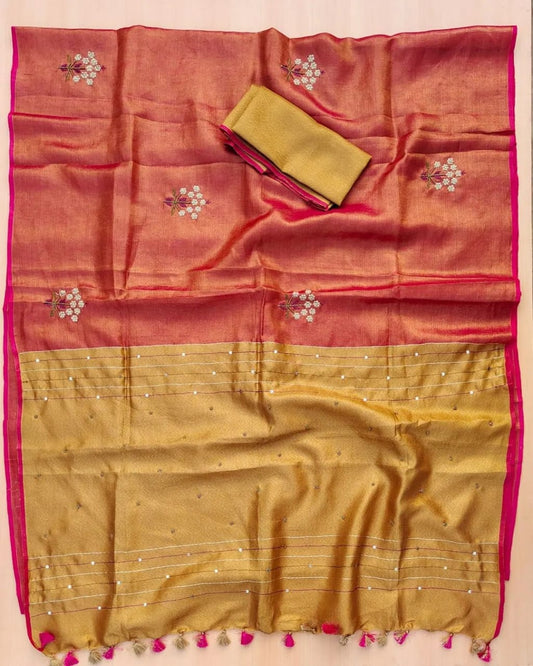 Dusky Orange Soft Tissue Linen Blend Saree with Hand Embroidery