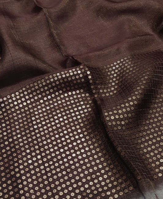 Brown Pure Muslin Sequinced Jamdani Saree with Matka Silk Blouse Piece