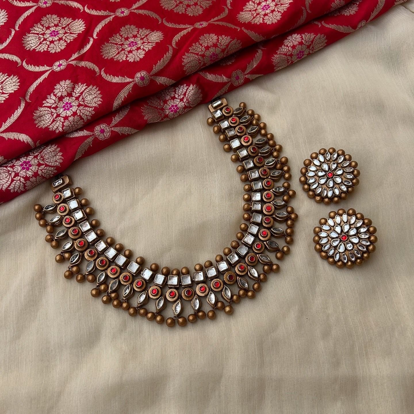 About the Product: This delicate piece of Shika is handcrafted to perfection.Your every moment deserves an elegance and we tune in. Terracotta neckwear with earrings in the endless red with gold shades .The neckwear comes with adjustable thread for the closure.